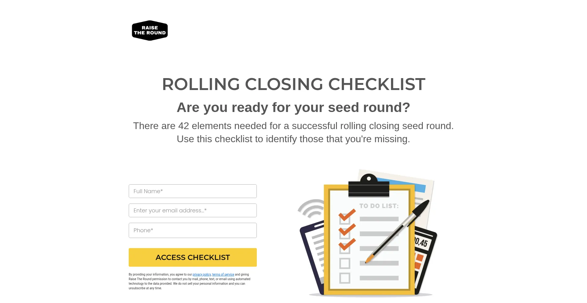 There are 42 parts needed for a successful rolling close seed round. Use this checklist to identify the parts that you're missing.