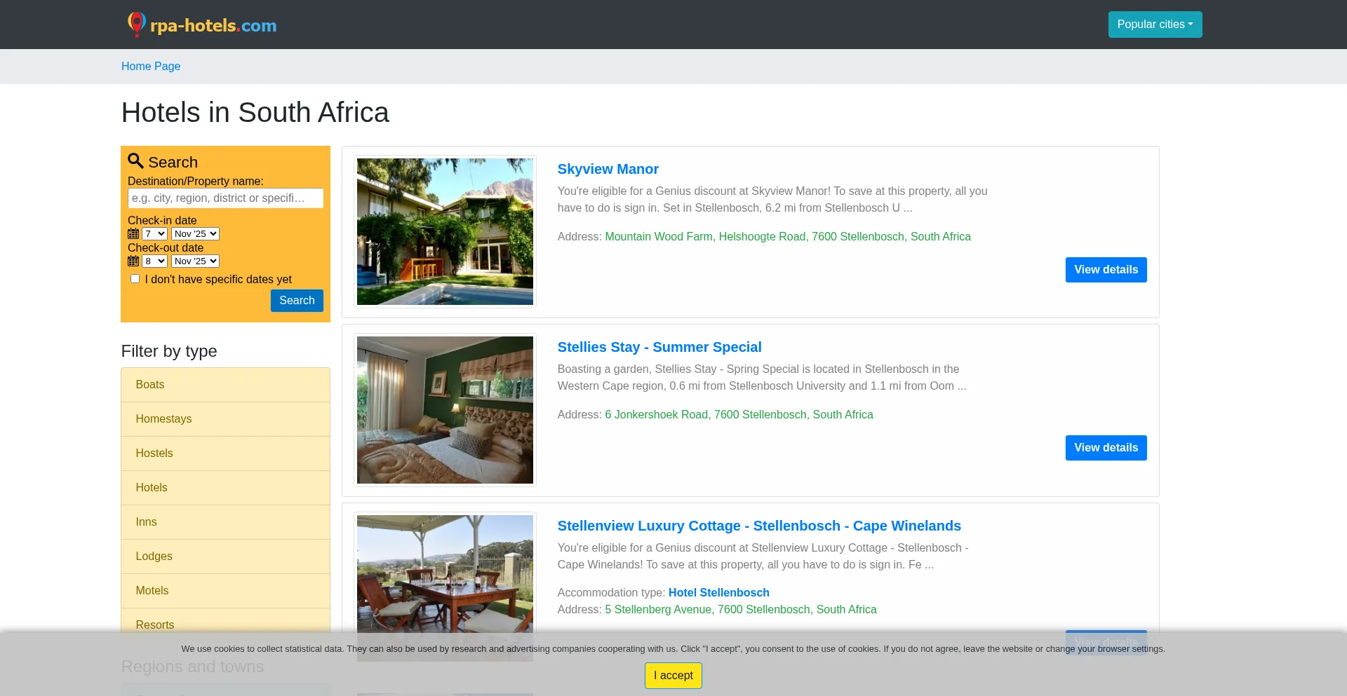 Plan your holidays in sunny South Africa. Book hotels or apartments at low prices with the possibility of cancellation. Book online.