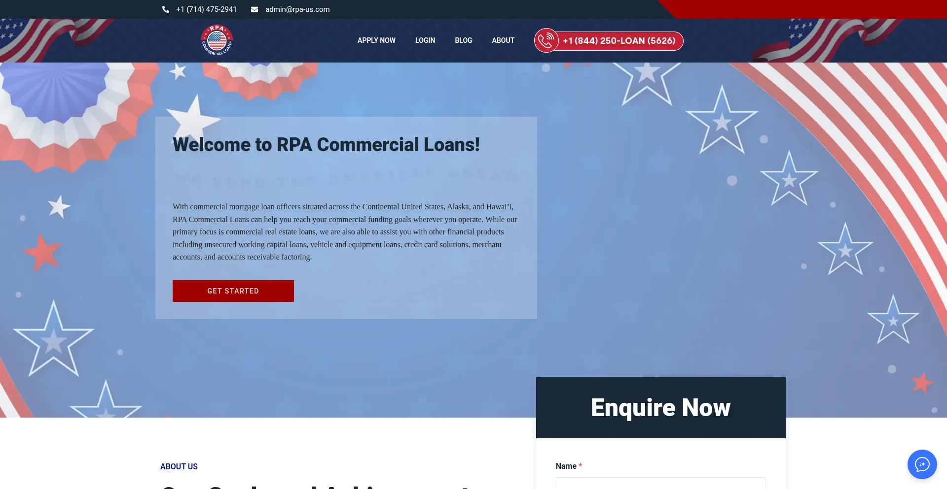 该网站实现数据收集表单,请求个人信息,包括姓名、电子邮件地址、电话号码或其他敏感详细信息。用户应验证 rpacommercialloans.com 的合法性并在提交个人数据前查看隐私政策。