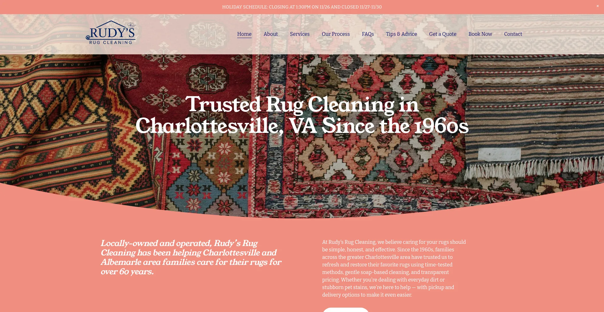 Rudy's Rug Cleaning has served the Charlottesville and Albemarle communities since the 1960s, offering professional, eco-friendly rug cleaning, pickup & delivery, and rug pad ...
