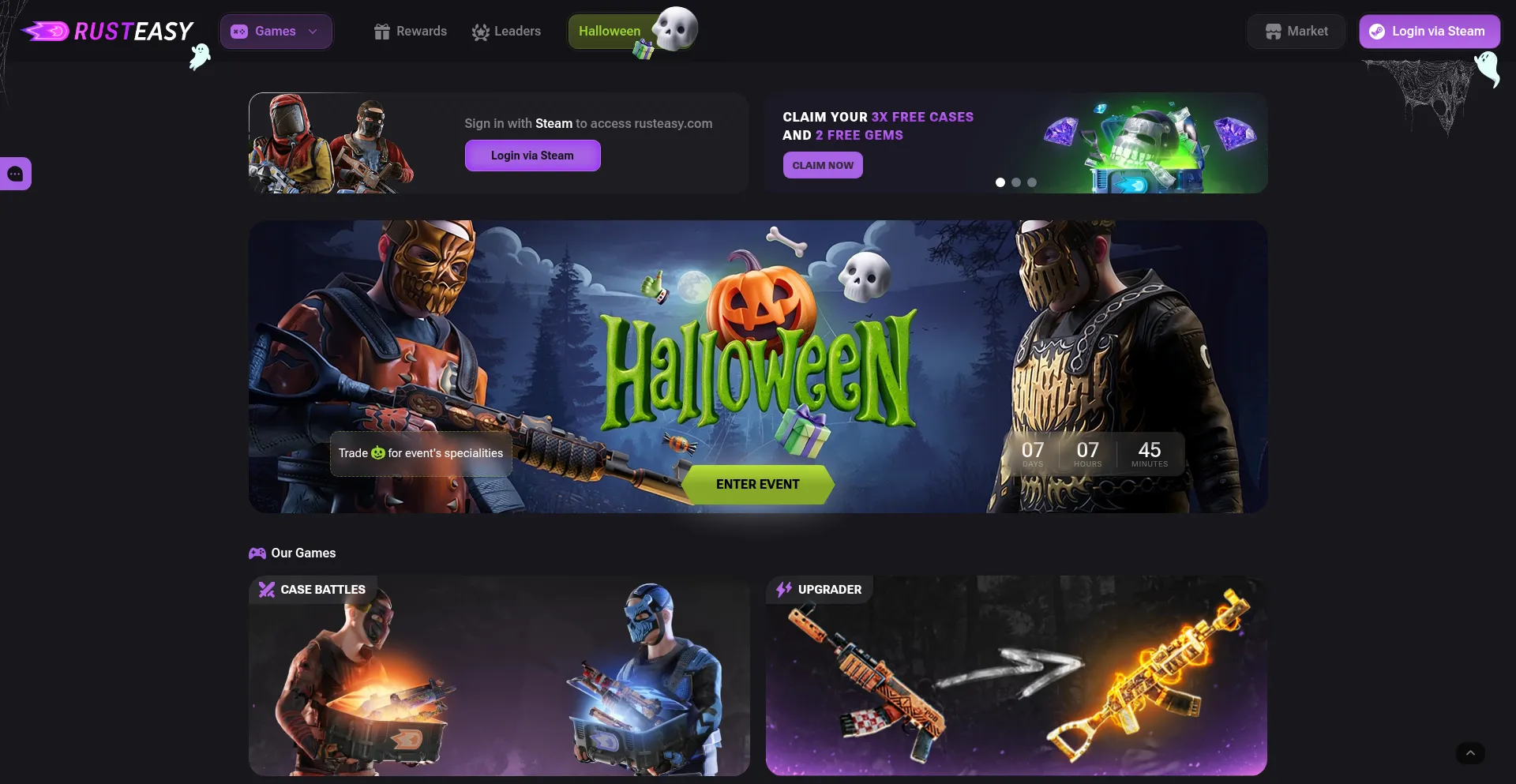 Join the ultimate Rust gaming platform with exciting modes like cases, case battles, coinflip, blackjack, and more. Play, win, and upgrade your inventory!