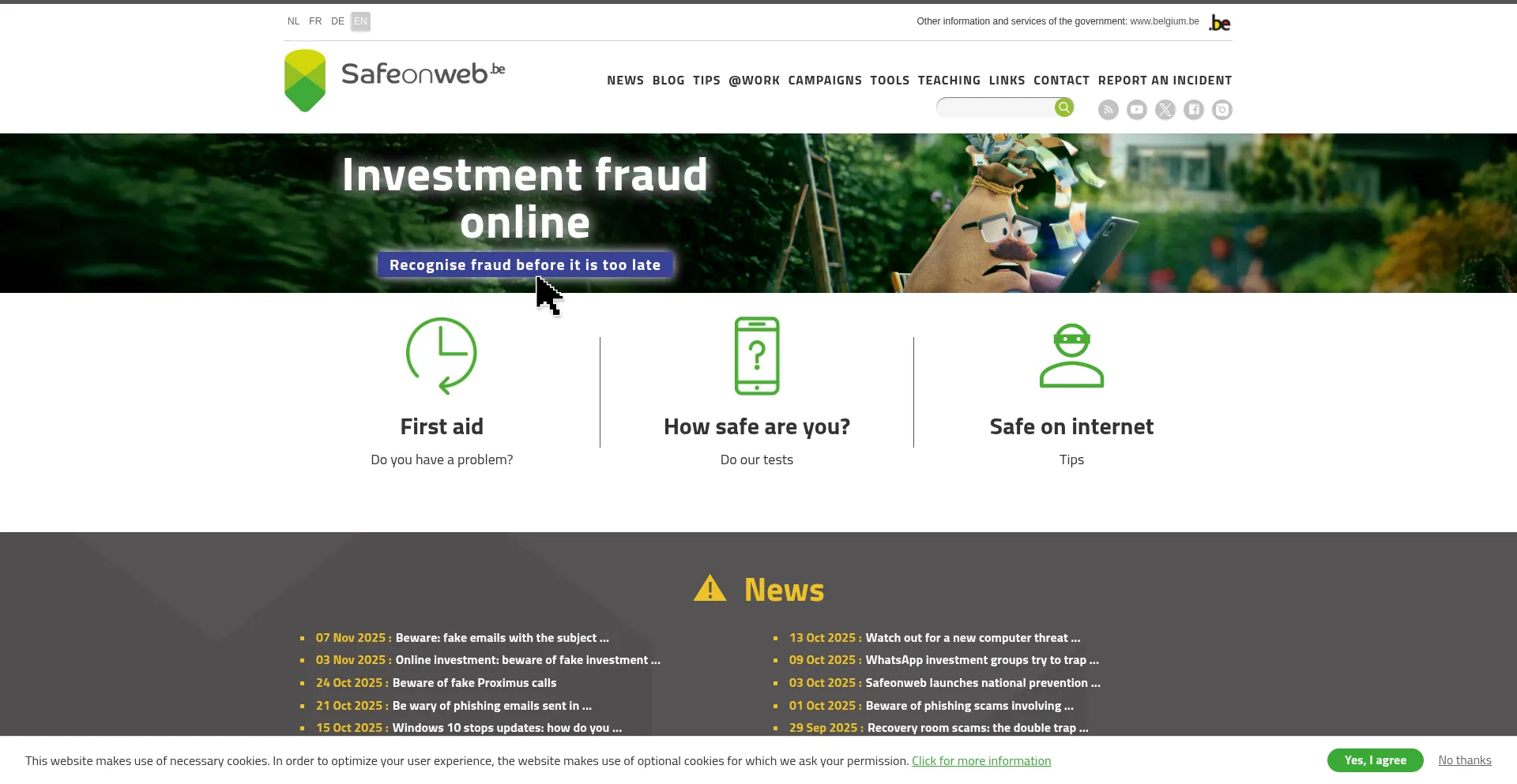 网站上存在社交媒体链接表明 safeonweb.be 在社交媒体上维护官方账户,这是可信度和参与度的积极信号。