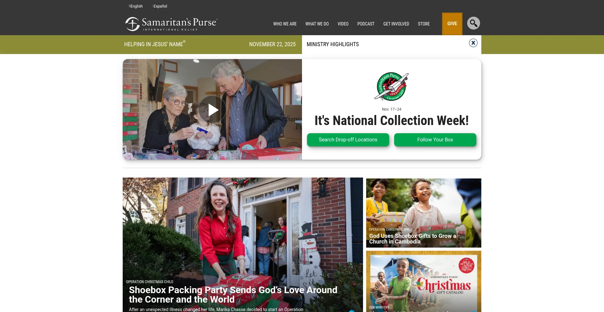 This is the home page for Samaritan's Purse, an international, nondenominational, evangelical Christian disaster relief organization.