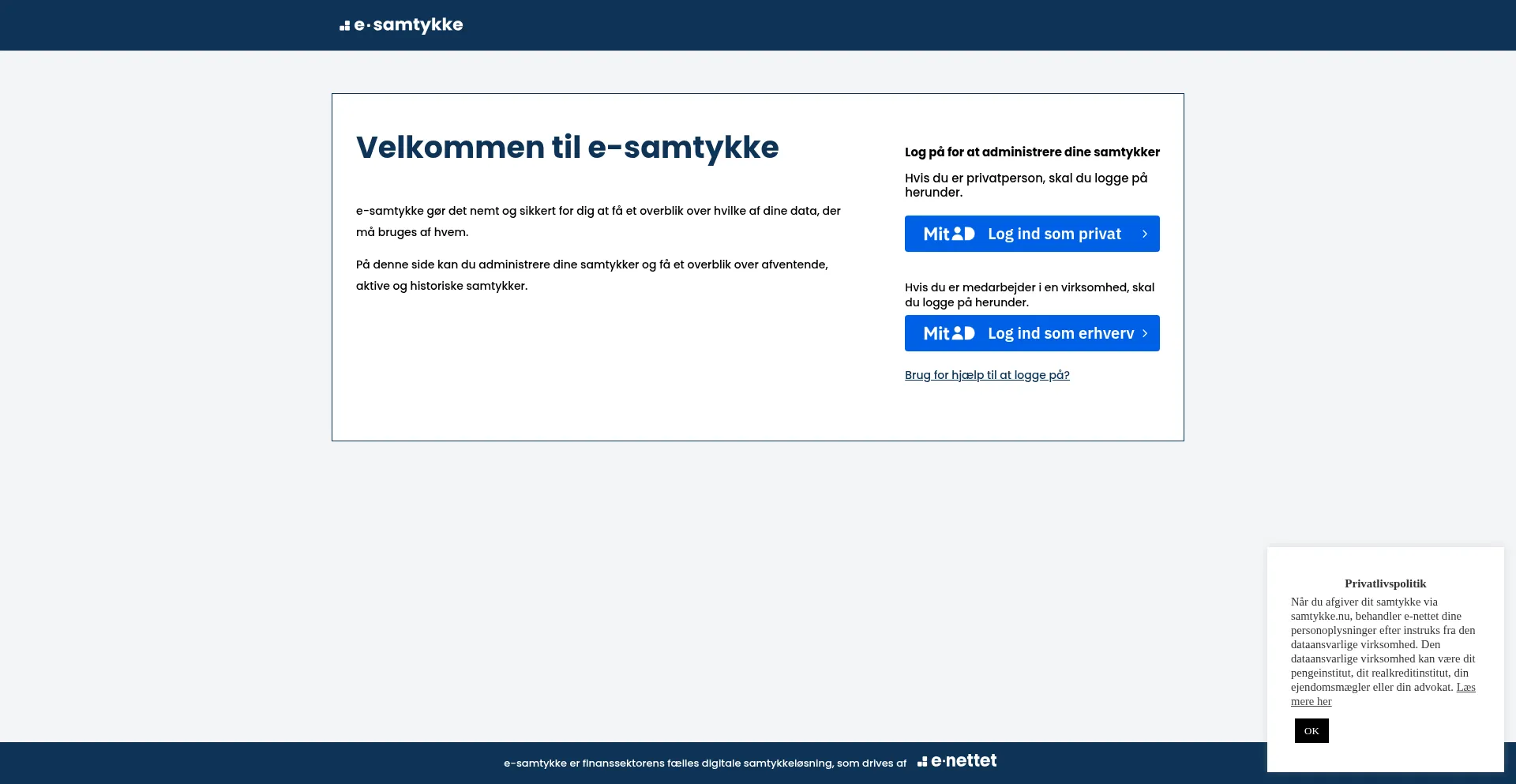 e-samtykke er finanssektorens fælles digitale samtykkeløsning. e-samtykke er frivilligt, specifikt, informeret, utvetydigt og muligt at trække tilbage.