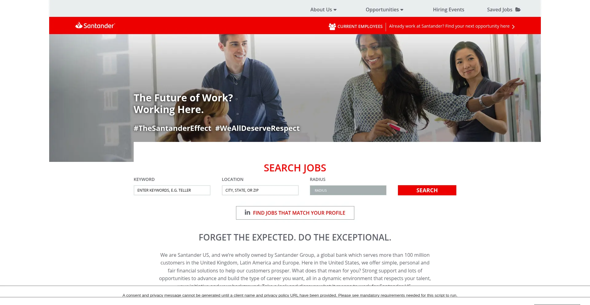 该网站实现符合GDPR或CCPA等隐私法规的cookie同意机制。这表明 santandercareers.com 遵守数据保护标准并为用户提供对个人数据收集实践的控制。