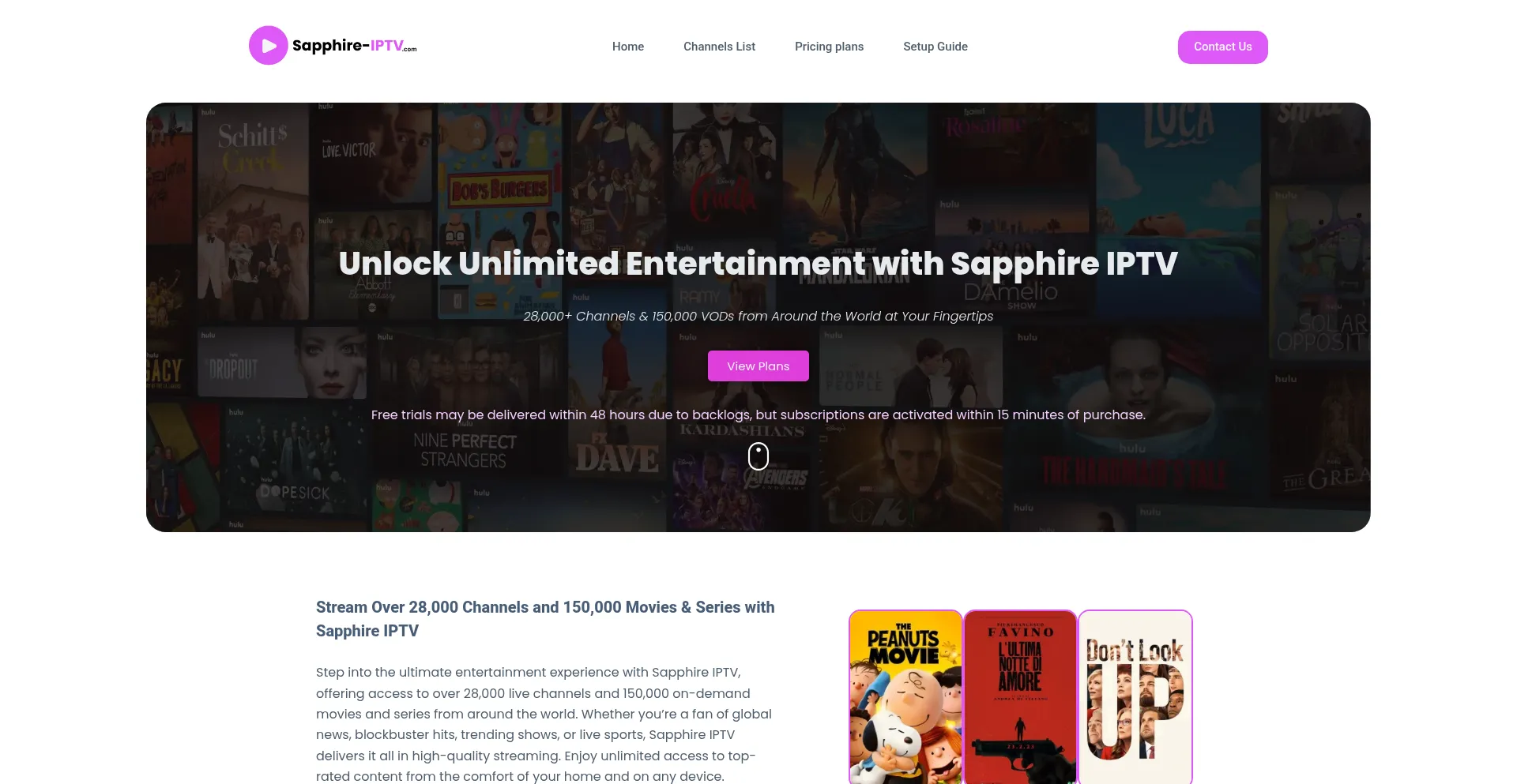 Stream 28,000+ live channels and 150,000 movies and series worldwide in HD with Sapphire IPTV. Flexible plans, 24/7 support, and multi-device compatibility.