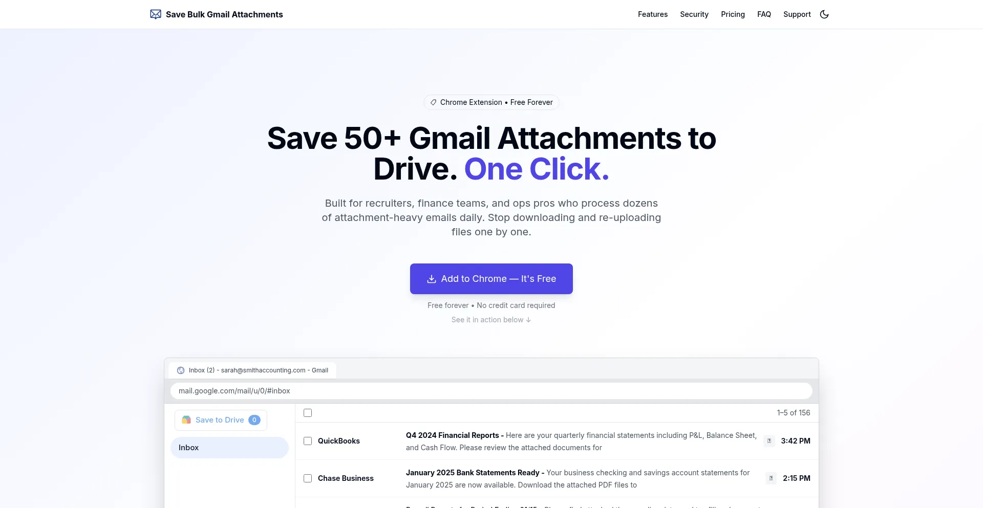 Cut 50+ clicks a day. Bulk-download or Drive-save every Gmail attachment with one secure Chrome extension. Try it free.