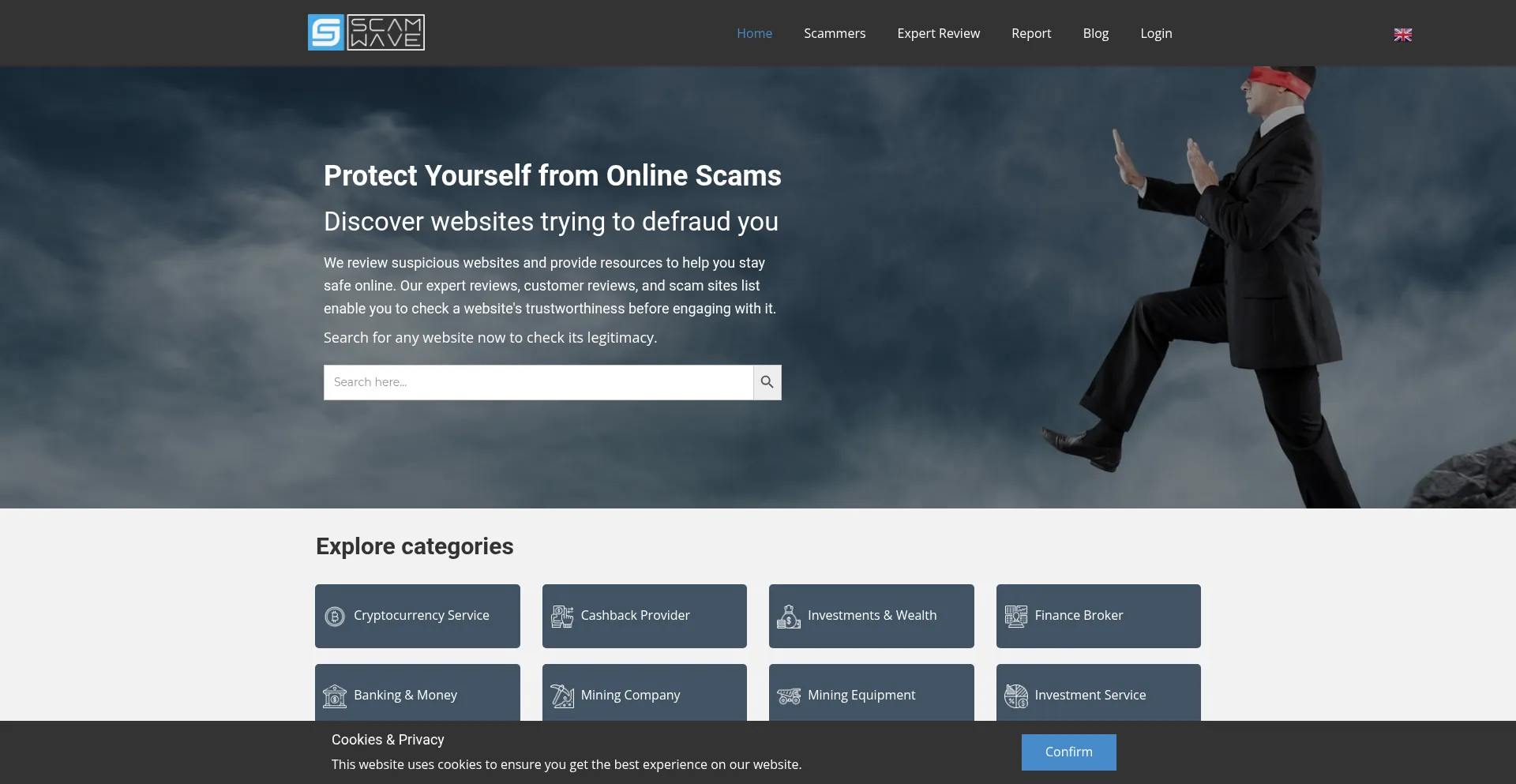 该网站实现数据收集表单,请求个人信息,包括姓名、电子邮件地址、电话号码或其他敏感详细信息。用户应验证 scamwave.com 的合法性并在提交个人数据前查看隐私政策。