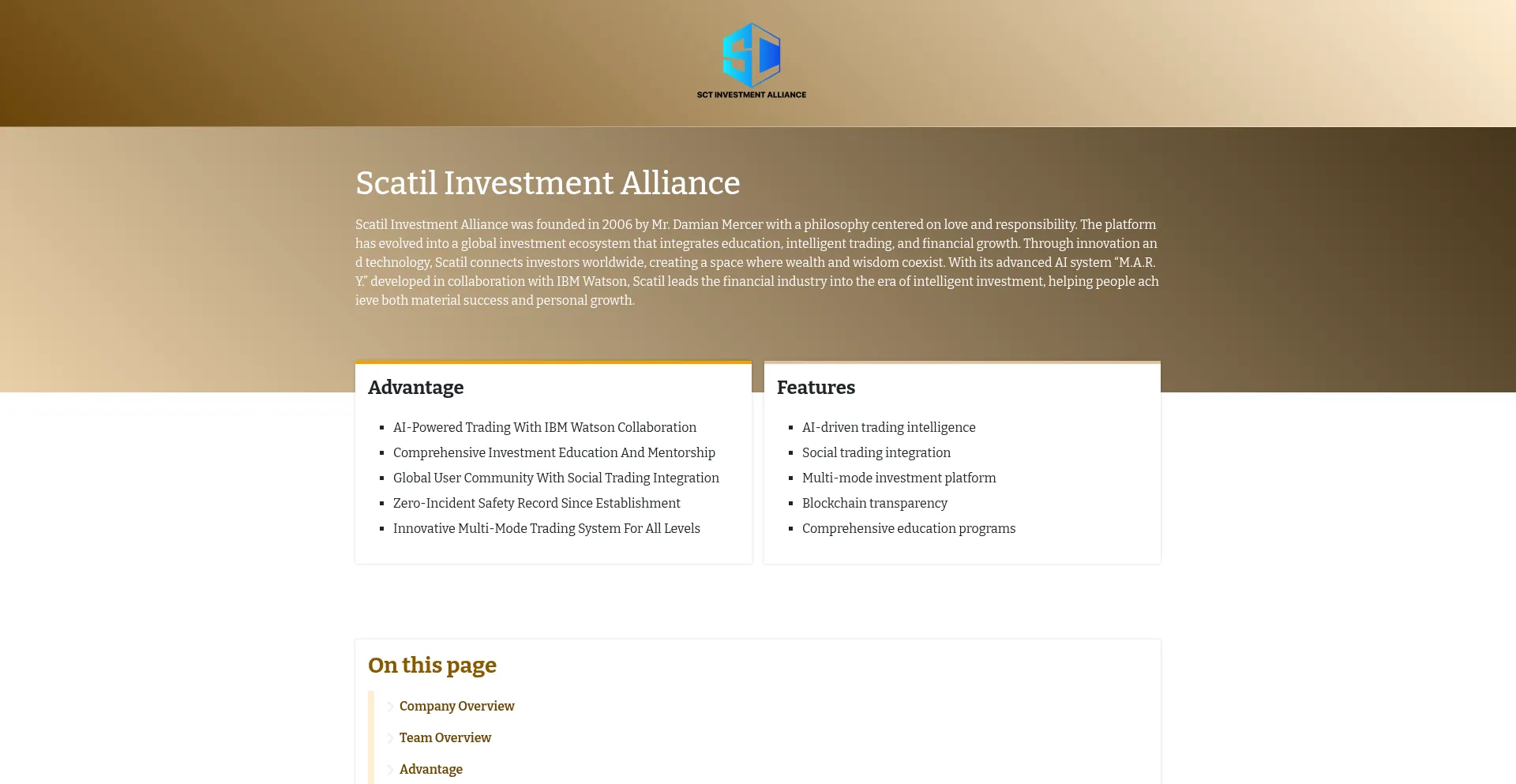 Explore Scatil Investment Alliance, a forward-thinking investment platform founded on love and responsibility. Discover its team, technology, transparency, and commitment to sec...