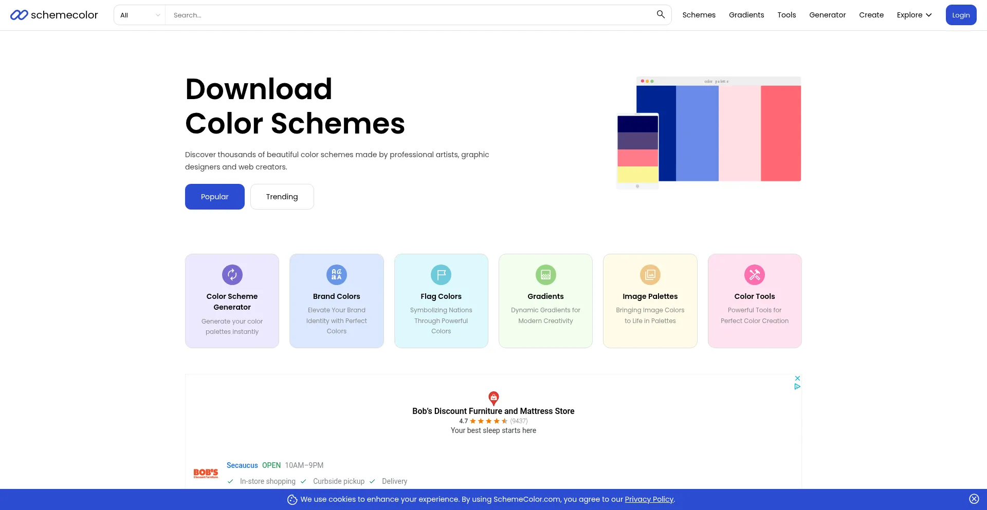 该网站实现符合GDPR或CCPA等隐私法规的cookie同意机制。这表明 schemecolor.com 遵守数据保护标准并为用户提供对个人数据收集实践的控制。
