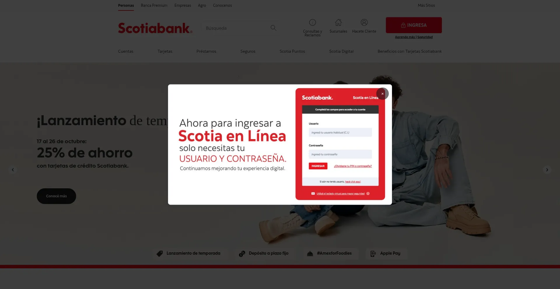 该网站实现数据收集表单,请求个人信息,包括姓名、电子邮件地址、电话号码或其他敏感详细信息。用户应验证 scotiabank.com.uy 的合法性并在提交个人数据前查看隐私政策。