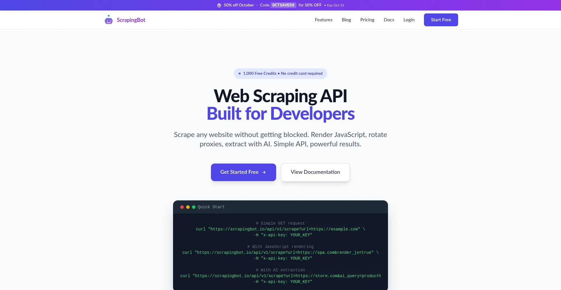 Scrape any website without getting blocked. Browser rendering, AI extraction, rotating proxies, and more. Get started with 1,000 free credits.