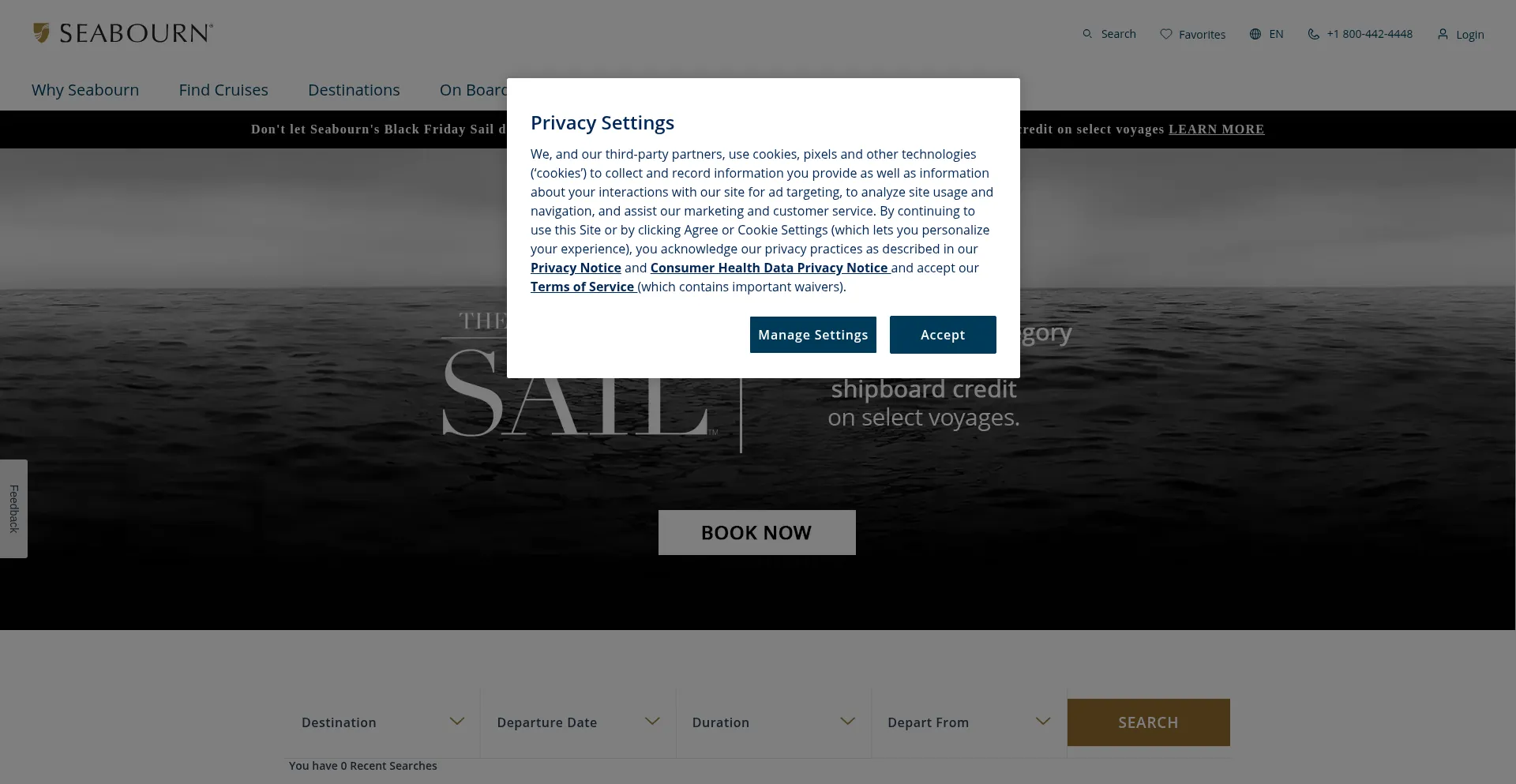 该网站实现符合GDPR或CCPA等隐私法规的cookie同意机制。这表明 seabourn.com 遵守数据保护标准并为用户提供对个人数据收集实践的控制。