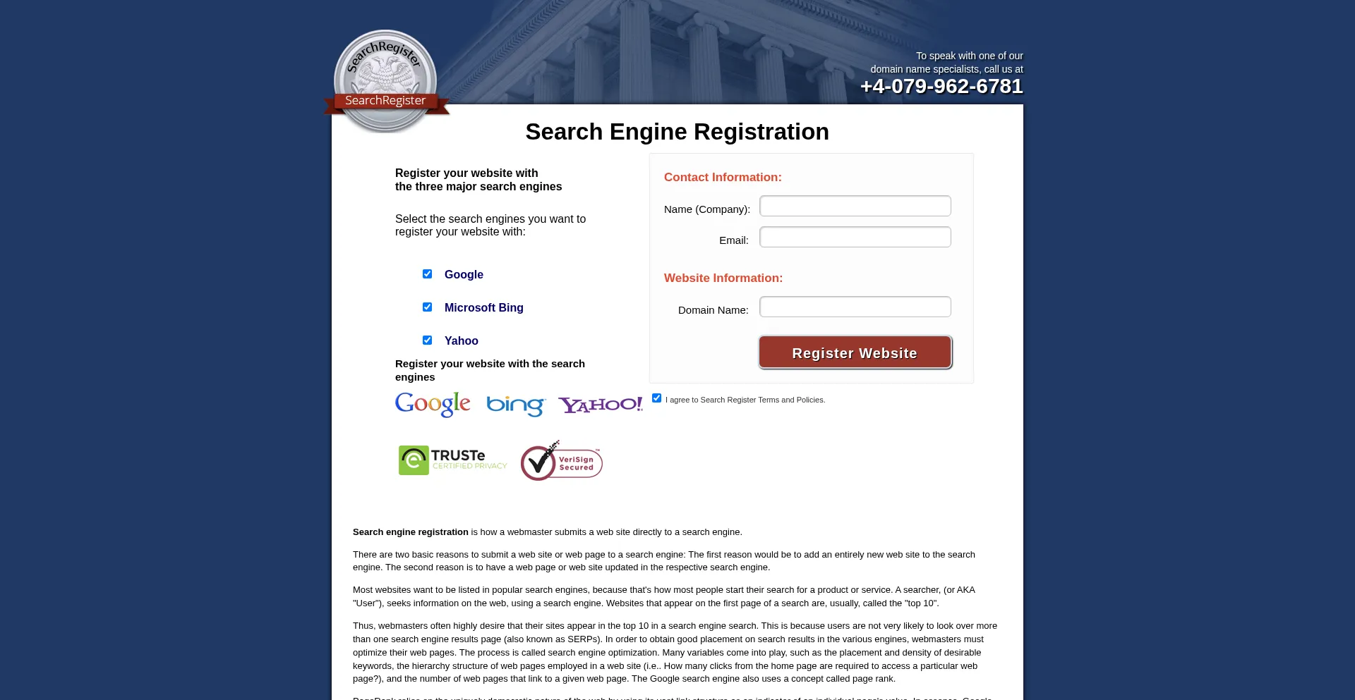 Search engine registration is how a webmaster submits a web site directly to a search engine. There are two basic reasons to submit a web site or web page to a search engine