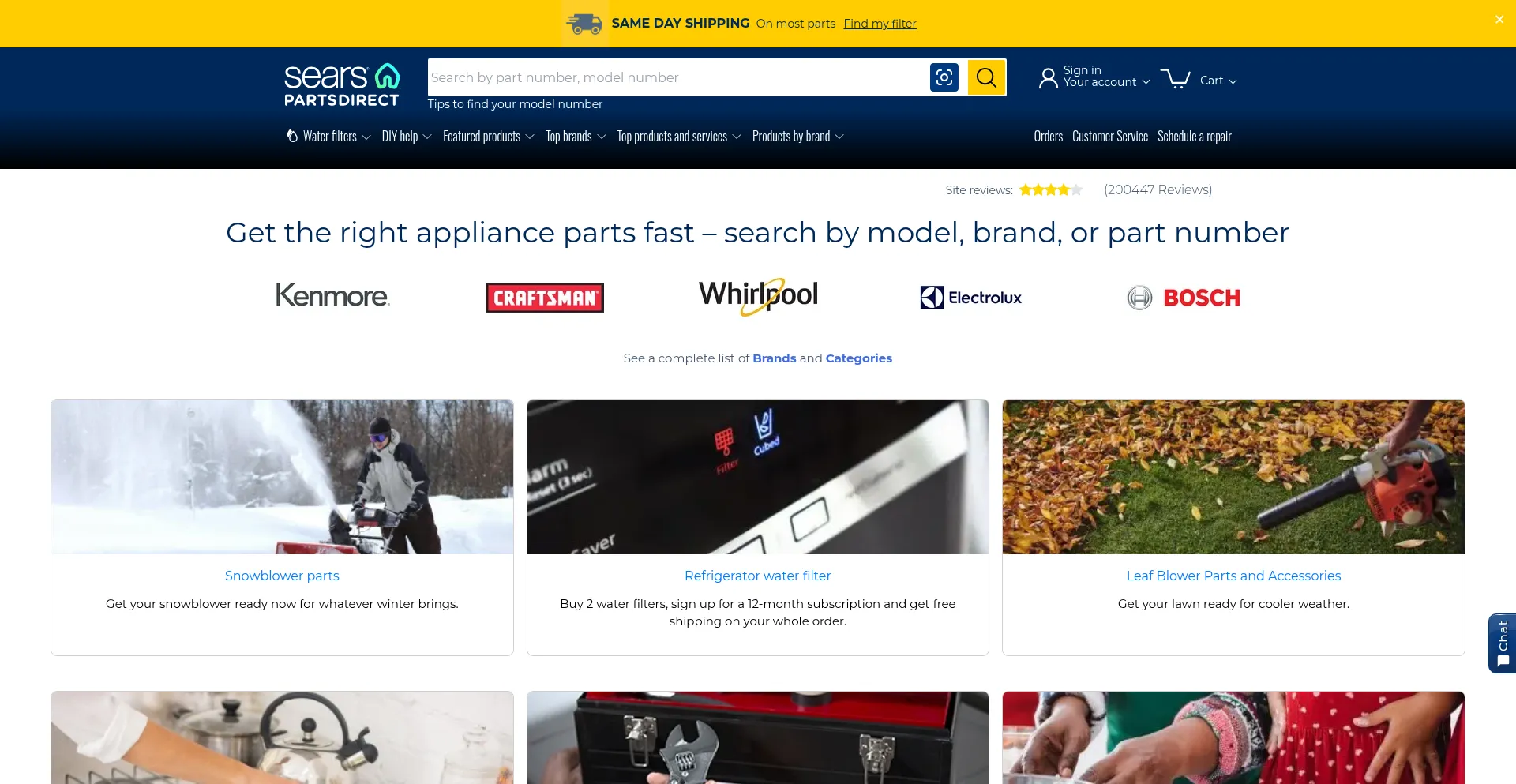 We carry millions of appliance parts, snow blower, lawn & garden replacement parts, water filters and more. No matter where you bought it, Sears Parts Direct has the right parts.