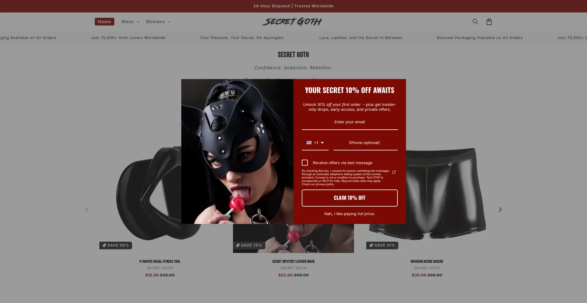 分析表明 secretgoth.com 作为电子商务平台运营,促进商品或服务的在线交易。该网站实现了购物车功能、支付处理系统和产品目录功能,这些是商业零售运营的典型特征。
