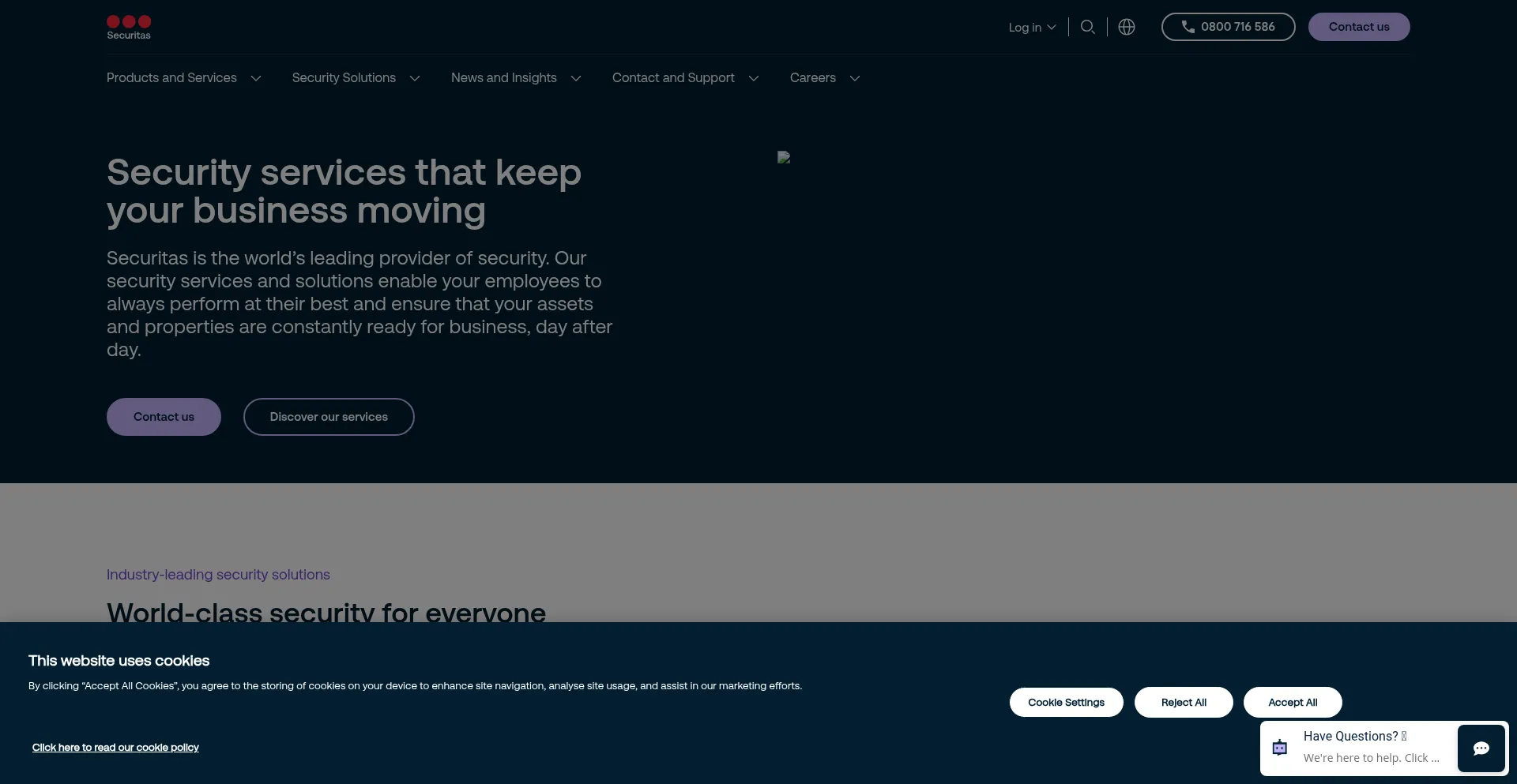该网站实现符合GDPR或CCPA等隐私法规的cookie同意机制。这表明 securitas.uk.com 遵守数据保护标准并为用户提供对个人数据收集实践的控制。