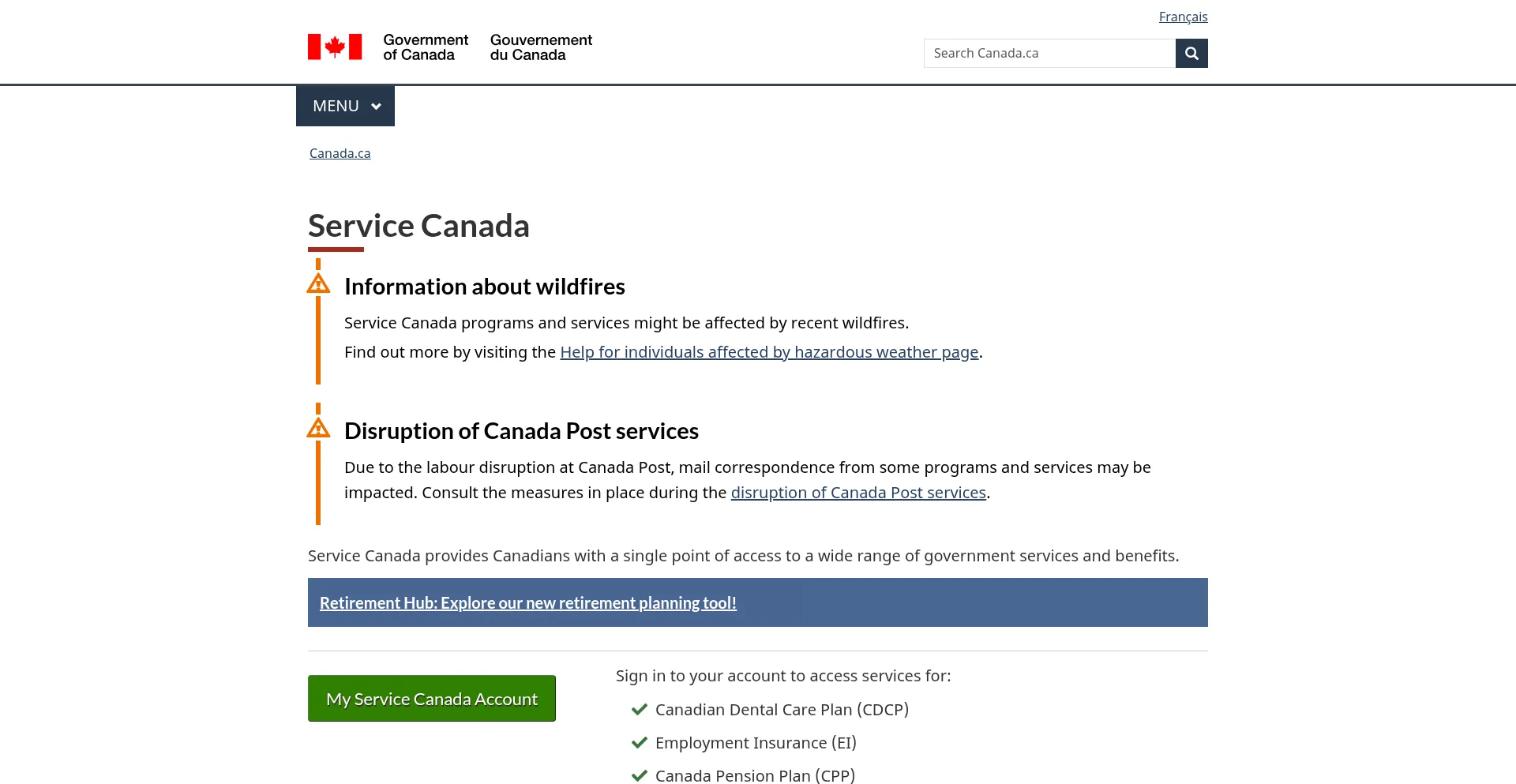 该网站实现数据收集表单,请求个人信息,包括姓名、电子邮件地址、电话号码或其他敏感详细信息。用户应验证 servicecanada.gc.ca 的合法性并在提交个人数据前查看隐私政策。