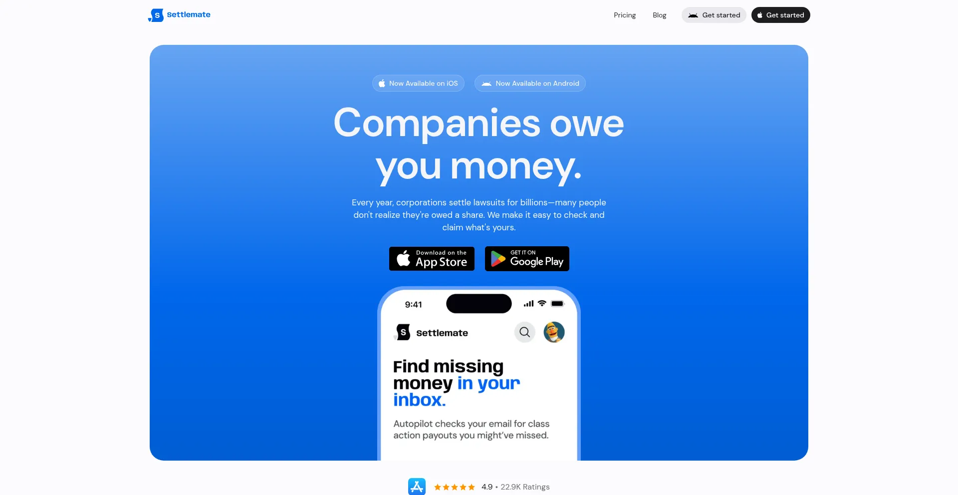 Claim money from class action settlements automatically. Settlemate finds lawsuits you qualify for and files claims without lawyers or paperwork.