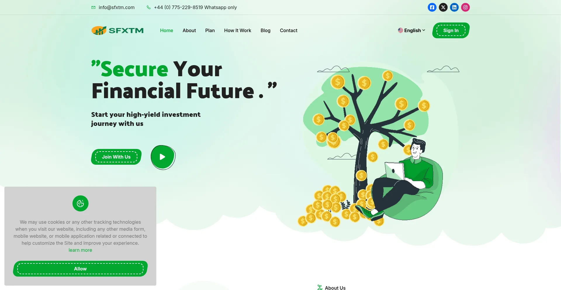 分析显示 sfxtm.com 显示社交媒体图标或链接,但不连接到合法的社交媒体档案。这种欺骗性做法通常用于创造虚假合法性,代表需要立即谨慎的欺诈意图的重要指标。