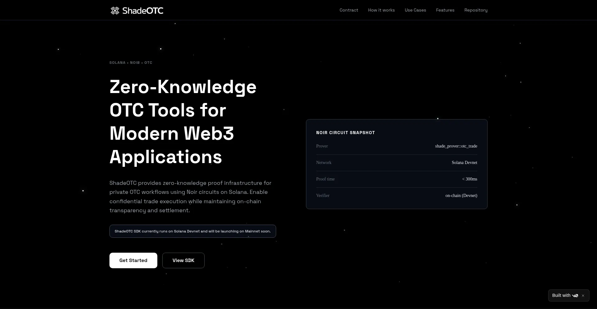 ShadeOTC provides zero-knowledge proof infrastructure for private OTC workflows using Noir circuits on Solana Devnet.