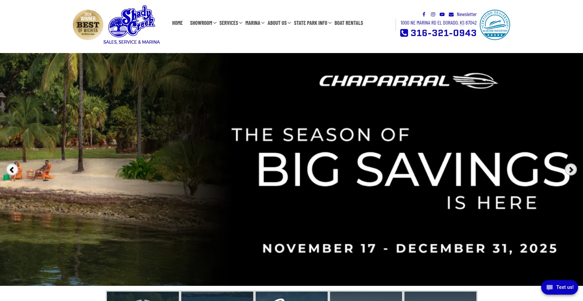Shady Creek Marina Sales & Service is a boat dealership located 25 miles North East of Wichita, Kansas, on El Dorado Lake. We sell new and used boats from Cobalt Boats, Chaparr...