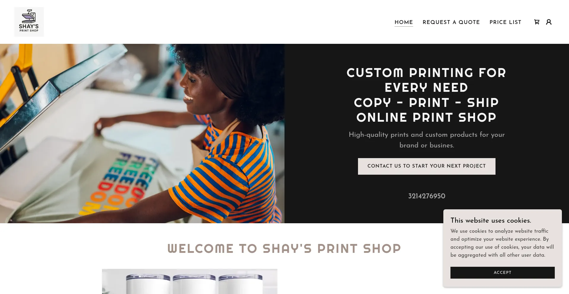 该网站实现符合GDPR或CCPA等隐私法规的cookie同意机制。这表明 shaysprintshop.com 遵守数据保护标准并为用户提供对个人数据收集实践的控制。