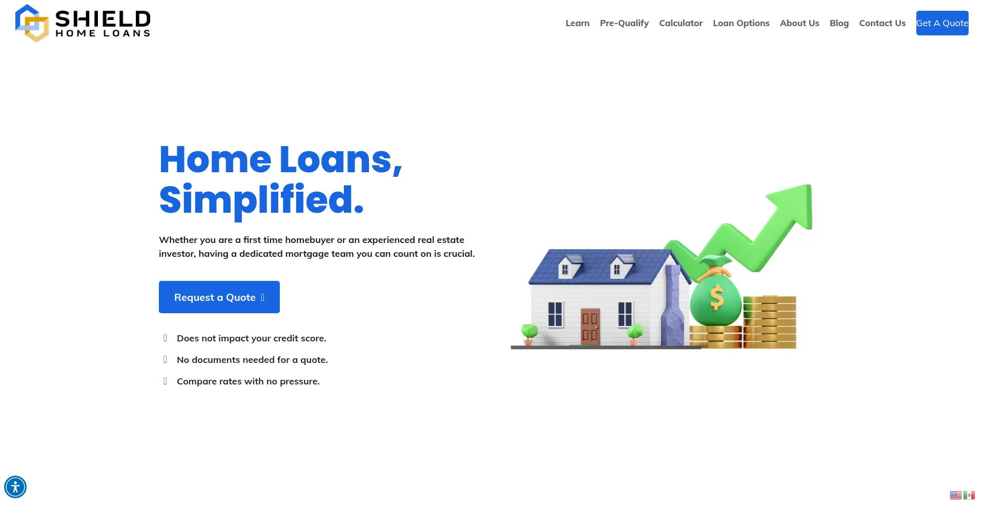 该网站实现数据收集表单,请求个人信息,包括姓名、电子邮件地址、电话号码或其他敏感详细信息。用户应验证 shieldhomeloans.com 的合法性并在提交个人数据前查看隐私政策。