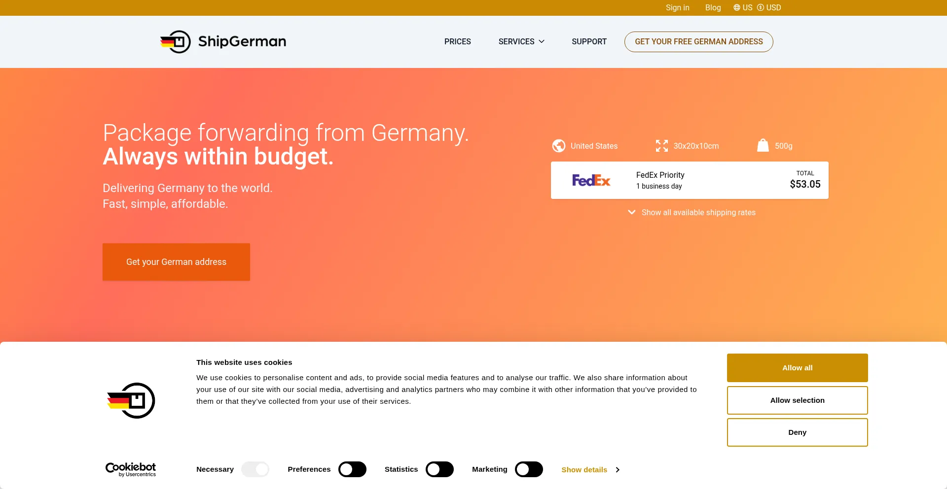 该网站实现符合GDPR或CCPA等隐私法规的cookie同意机制。这表明 shipgerman.com 遵守数据保护标准并为用户提供对个人数据收集实践的控制。