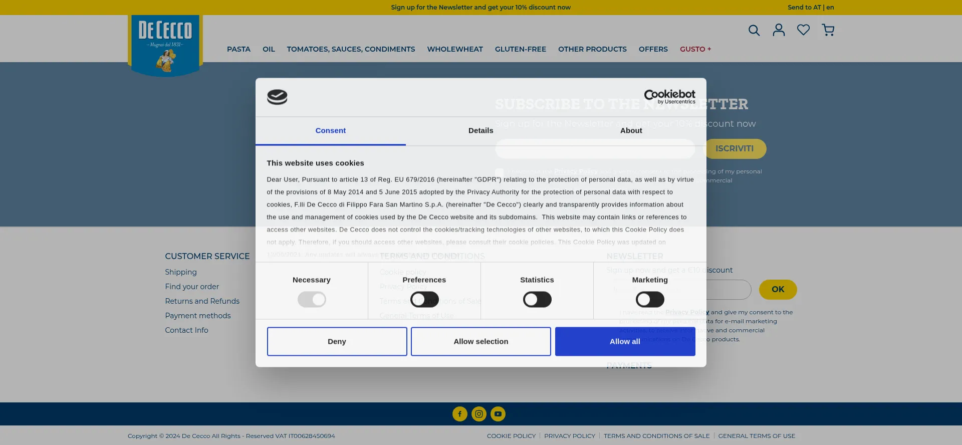 该网站实现符合GDPR或CCPA等隐私法规的cookie同意机制。这表明 shop.dececco.com 遵守数据保护标准并为用户提供对个人数据收集实践的控制。