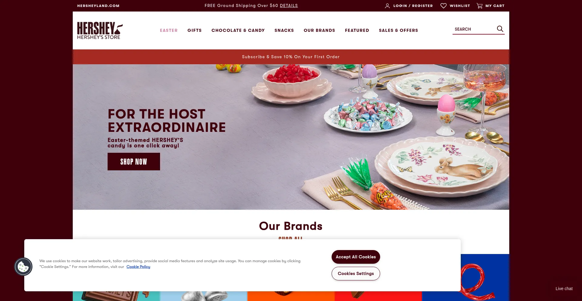 该网站实现符合GDPR或CCPA等隐私法规的cookie同意机制。这表明 shop.hersheys.com 遵守数据保护标准并为用户提供对个人数据收集实践的控制。