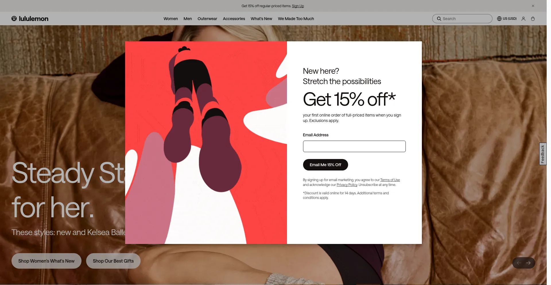 该网站实现数据收集表单,请求个人信息,包括姓名、电子邮件地址、电话号码或其他敏感详细信息。用户应验证 shop.lululemon.com 的合法性并在提交个人数据前查看隐私政策。