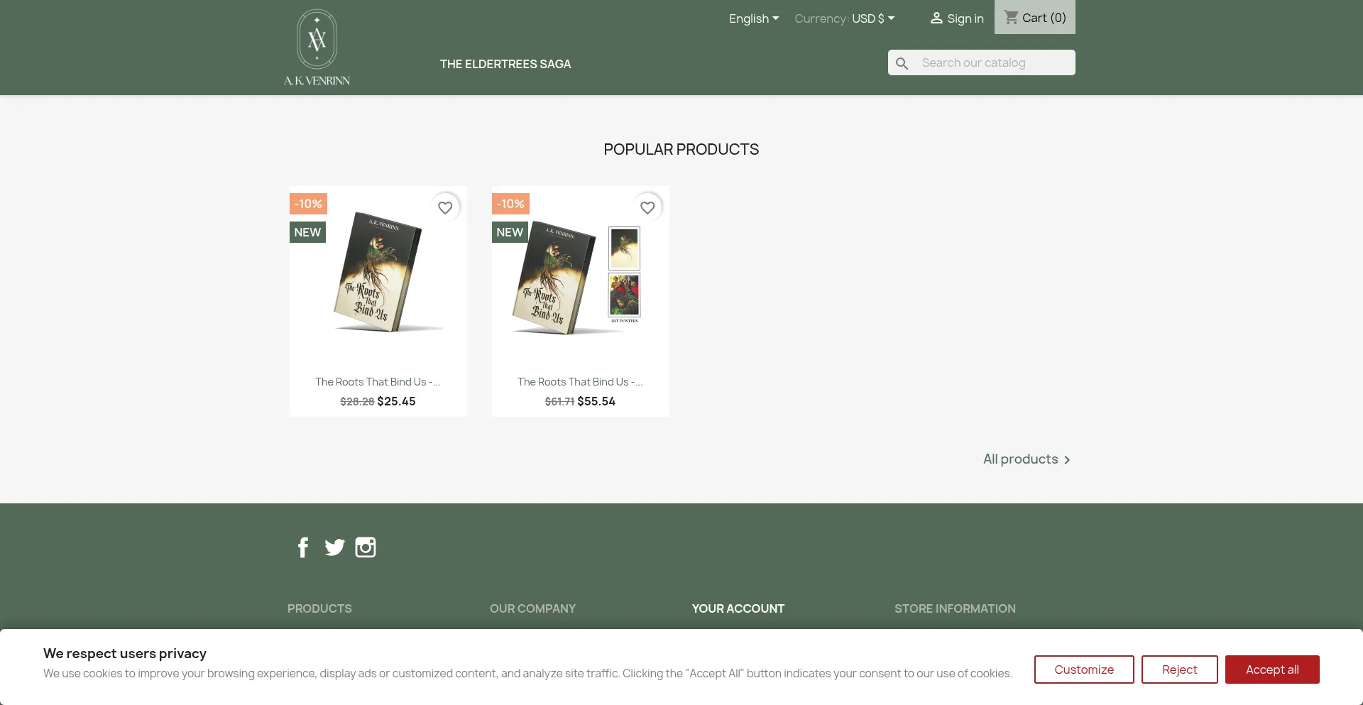 该网站实现符合GDPR或CCPA等隐私法规的cookie同意机制。这表明 shop.venrinn.com 遵守数据保护标准并为用户提供对个人数据收集实践的控制。