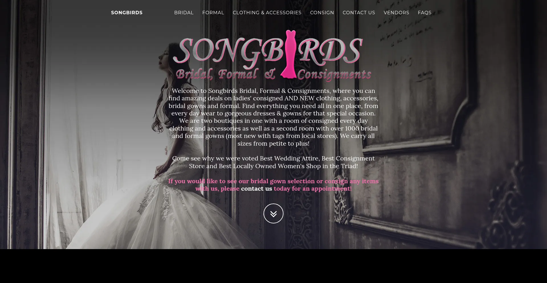 Welcome to Songbirds Bridal, Formal & Consignments, where you can find amazing deals on ladies' consigned AND NEW clothing, accessories, bridal gowns and formal.