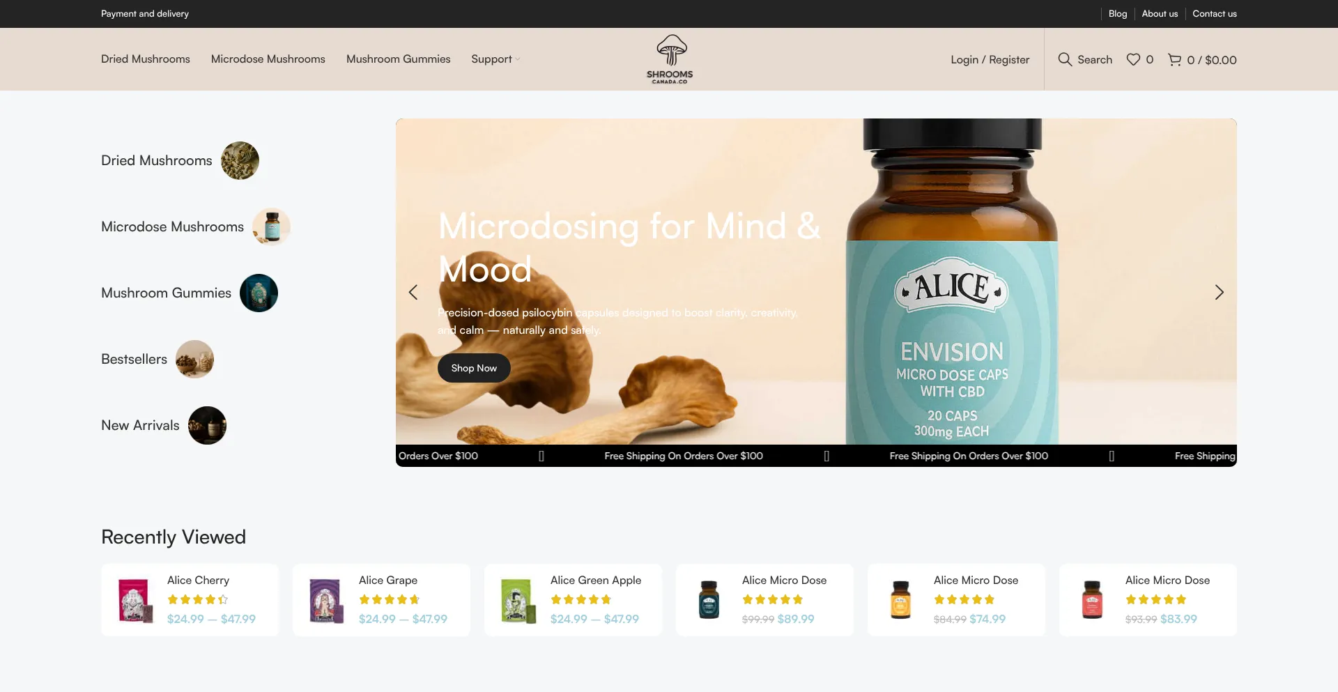分析表明 shroomscanada.co 作为电子商务平台运营,促进商品或服务的在线交易。该网站实现了购物车功能、支付处理系统和产品目录功能,这些是商业零售运营的典型特征。