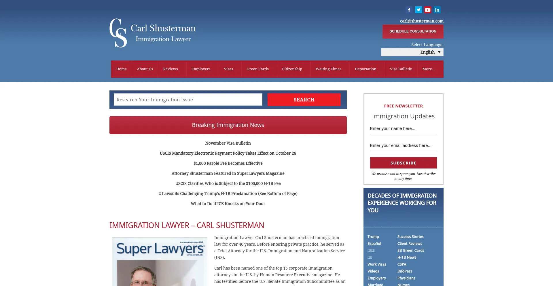 Immigration Lawyer Carl Shusterman has 40+ years of experience. He served as an attorney for the U.S. Immigration and Naturalization Service (1976-82).