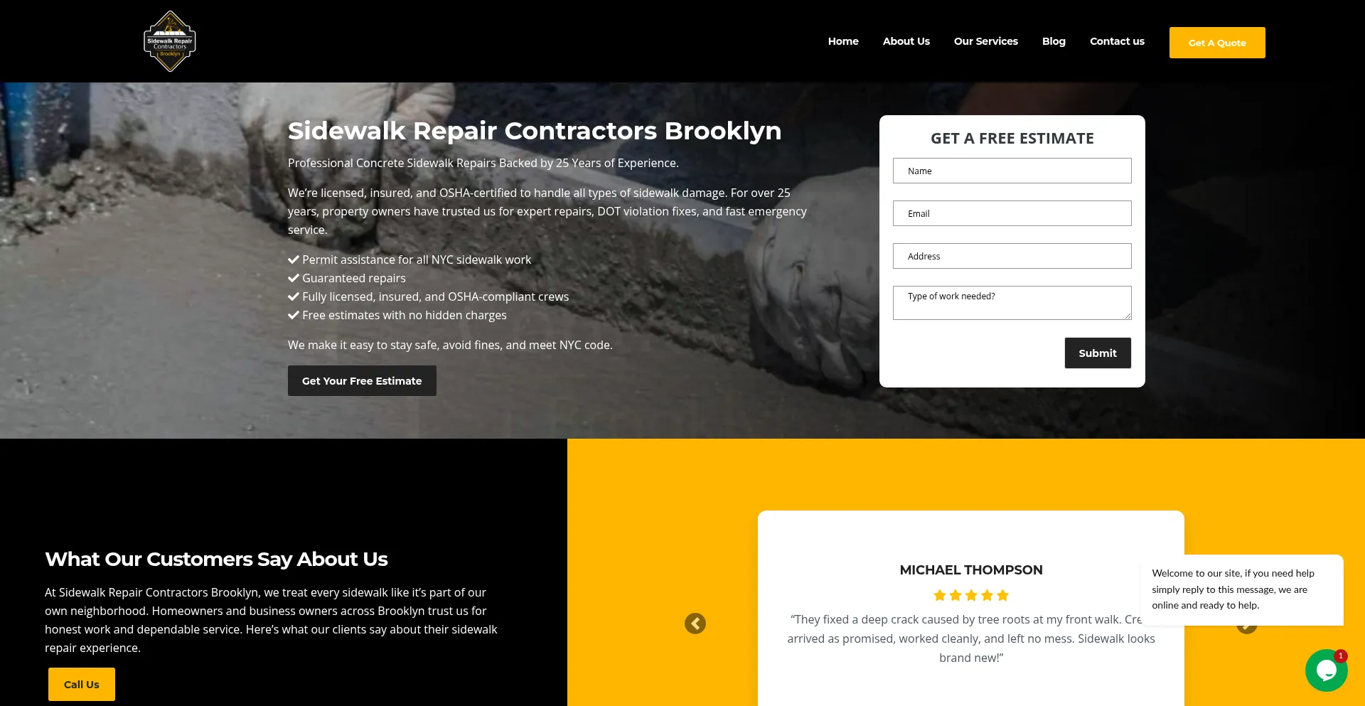 sidewalkrepaircontractorsbrooklyn.com 使用 Bootstrap,这是一个广泛采用的开源响应式网页开发框架。Bootstrap 通过标准化组件和样式实现移动友好界面的高效创建。