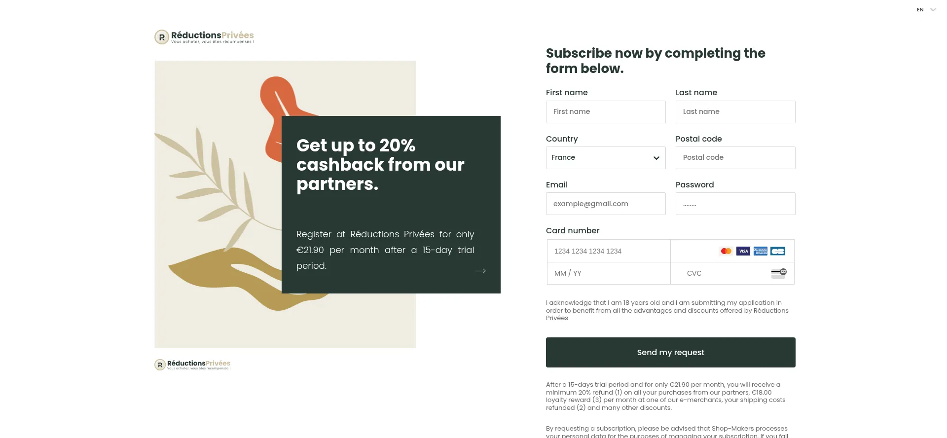 该网站实现数据收集表单,请求个人信息,包括姓名、电子邮件地址、电话号码或其他敏感详细信息。用户应验证 signup.reductionsprivees.com 的合法性并在提交个人数据前查看隐私政策。