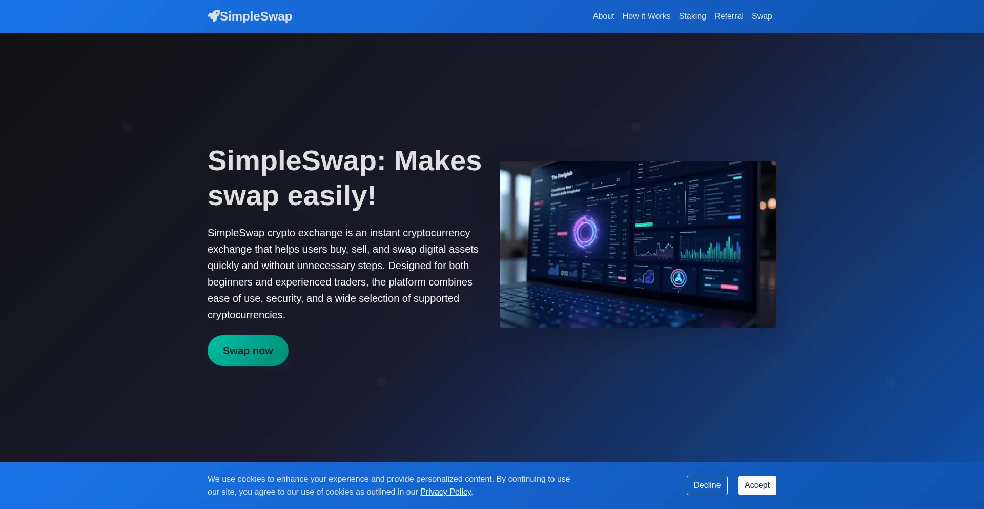 该网站实现符合GDPR或CCPA等隐私法规的cookie同意机制。这表明 simpleswap.ac 遵守数据保护标准并为用户提供对个人数据收集实践的控制。