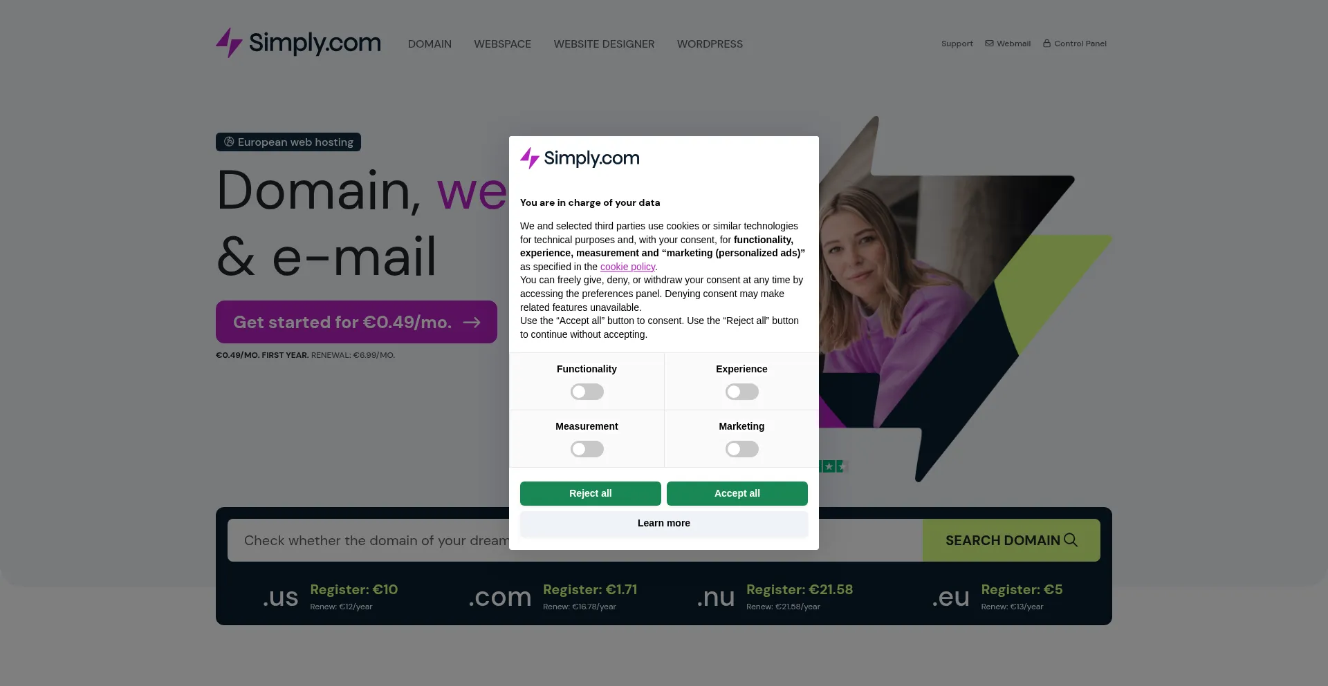 该网站实现符合GDPR或CCPA等隐私法规的cookie同意机制。这表明 simply.com 遵守数据保护标准并为用户提供对个人数据收集实践的控制。