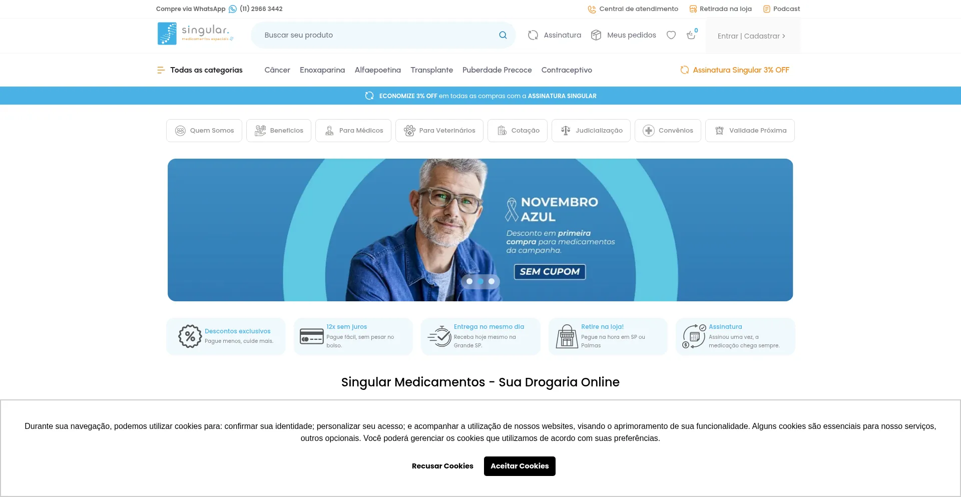 该网站实现数据收集表单,请求个人信息,包括姓名、电子邮件地址、电话号码或其他敏感详细信息。用户应验证 singularmedicamentos.com.br 的合法性并在提交个人数据前查看隐私政策。