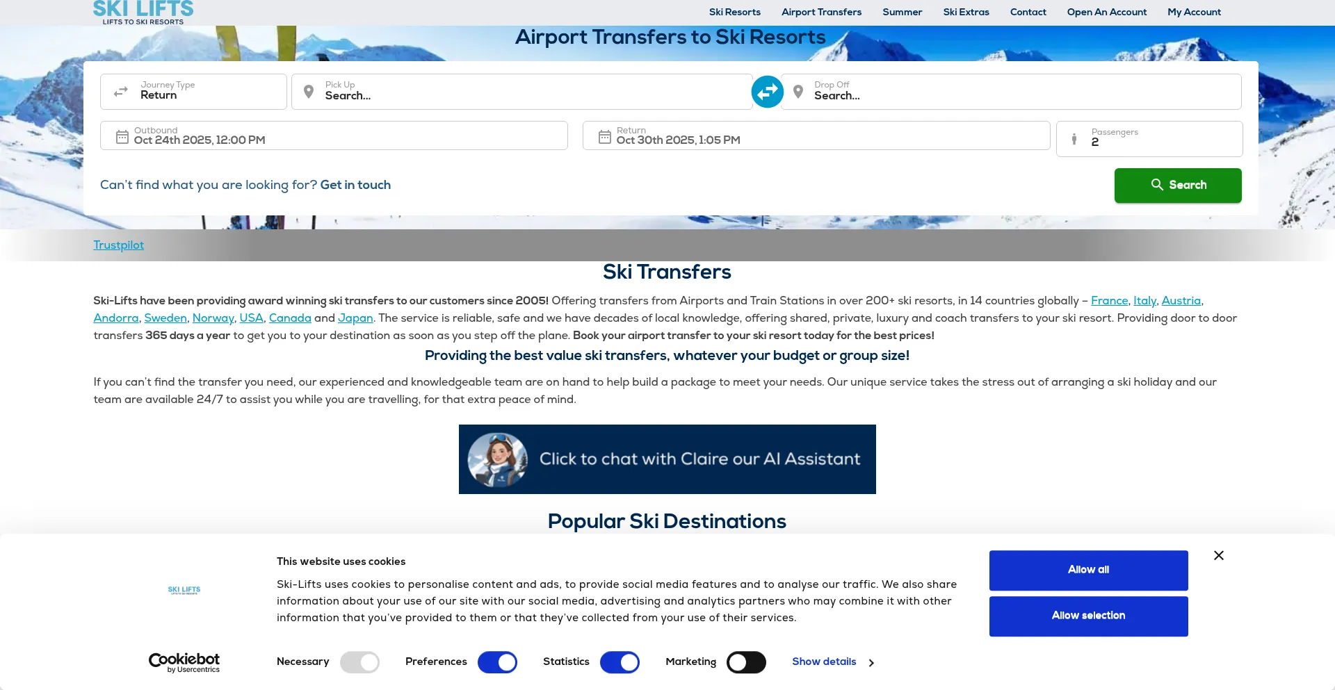 Award Winning ski transfers to over 200+ ski resorts through Europe and North America. Offering a wide range of private and shared transfers.