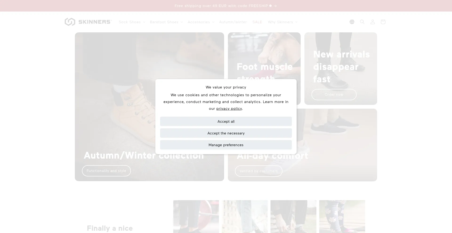 该网站实现符合GDPR或CCPA等隐私法规的cookie同意机制。这表明 skinnersfootwear.eu 遵守数据保护标准并为用户提供对个人数据收集实践的控制。