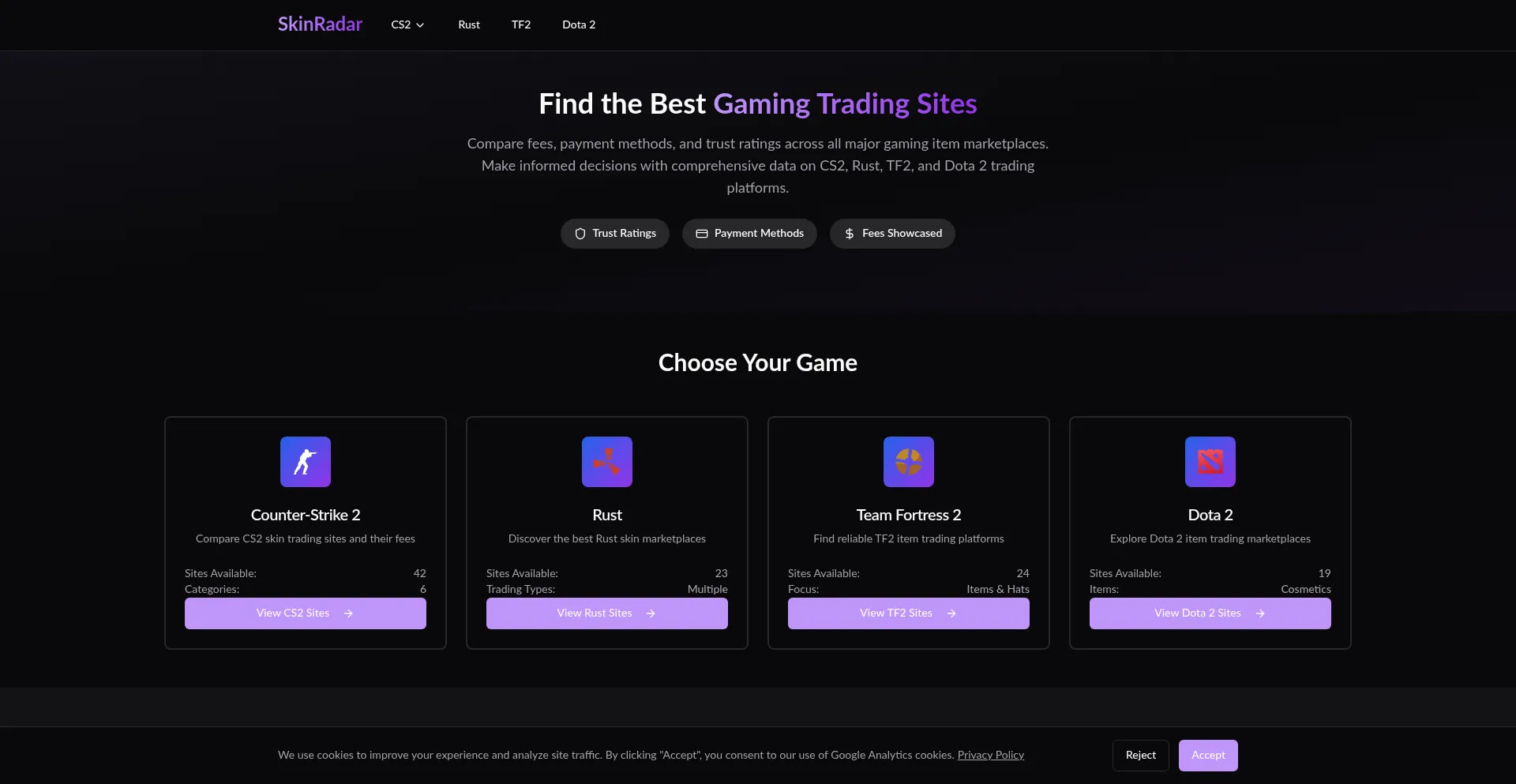 Compare trading sites for CS2, Rust, TF2, and Dota 2. Find the best fees, payment methods, and ratings across all major gaming marketplaces.