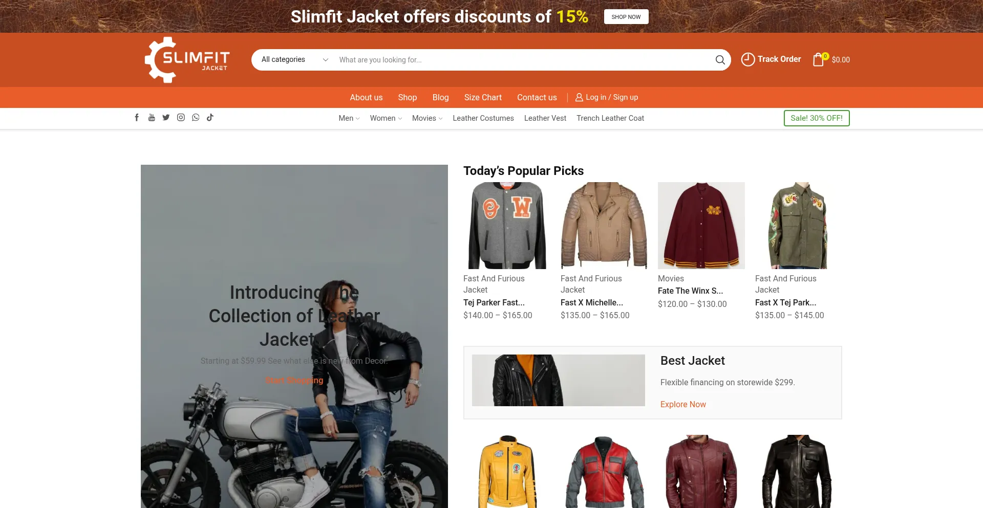 网站上存在社交媒体链接表明 slimfitjacket.com 在社交媒体上维护官方账户,这是可信度和参与度的积极信号。