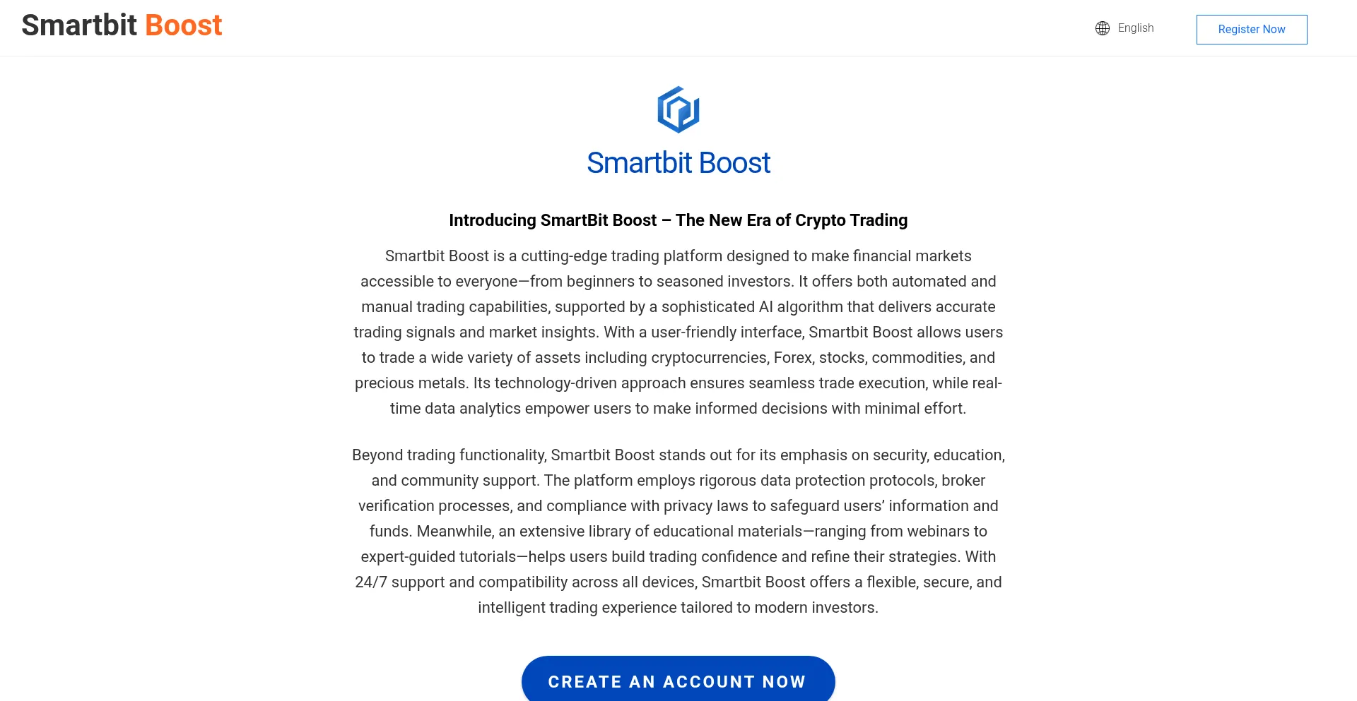 Smartbit Boost is an AI-powered trading platform that combines automation, real-time analytics, and advanced security to simplify and optimize trading across global financial ma...