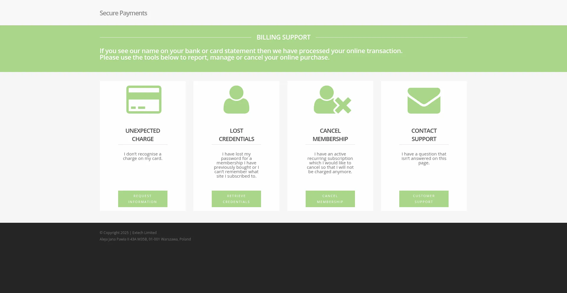 该网站包含专门处理付款争议、订阅管理、退款程序、退款政策和其他金融交易关注的部分,表明已建立的计费运营。