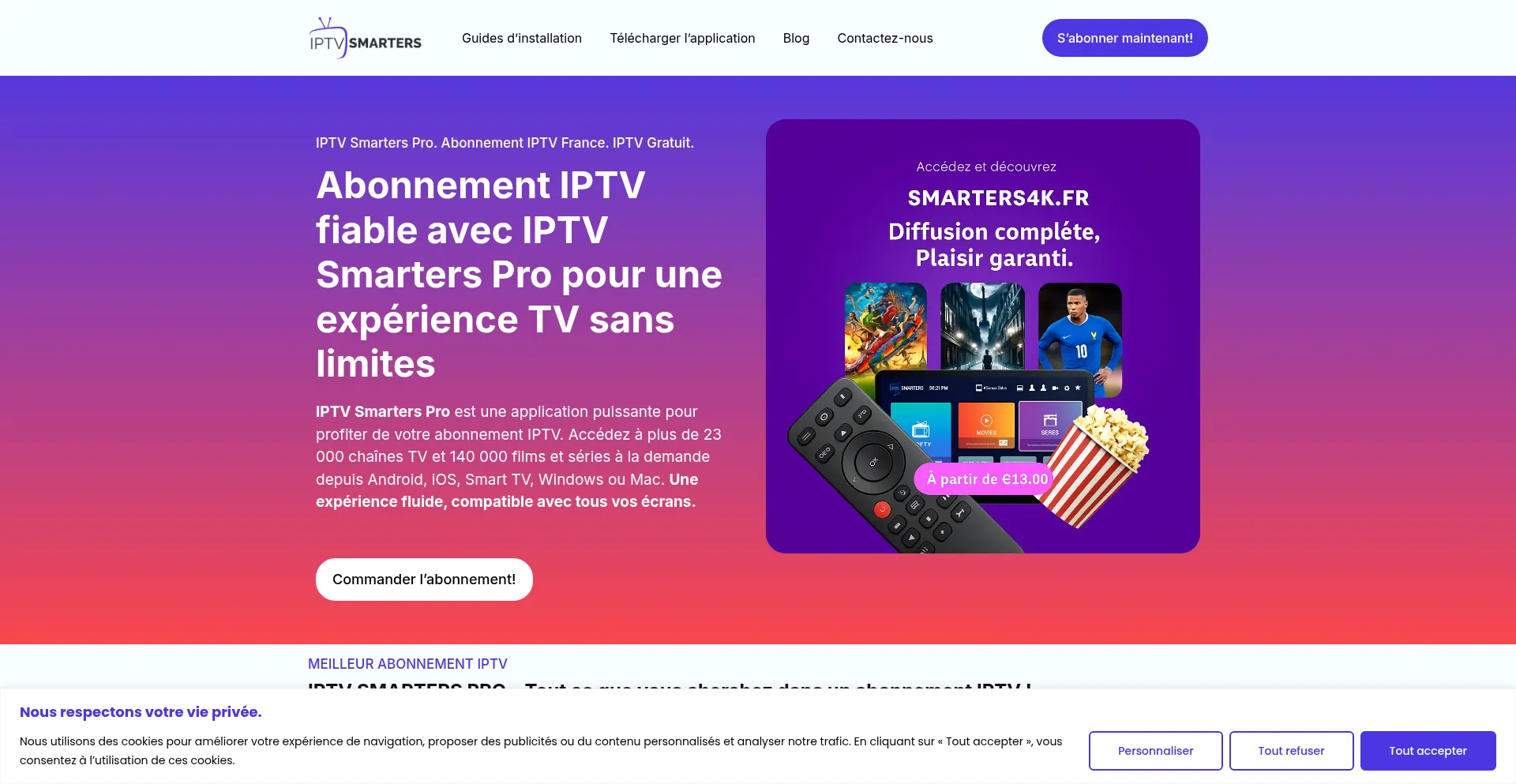 Profitez d’un abonnement IPTV en France avec IPTV Smarters Pro. +23 000 chaînes, +140 000 VOD. Compatible Android, Smart TV, Windows, iOS et plus.