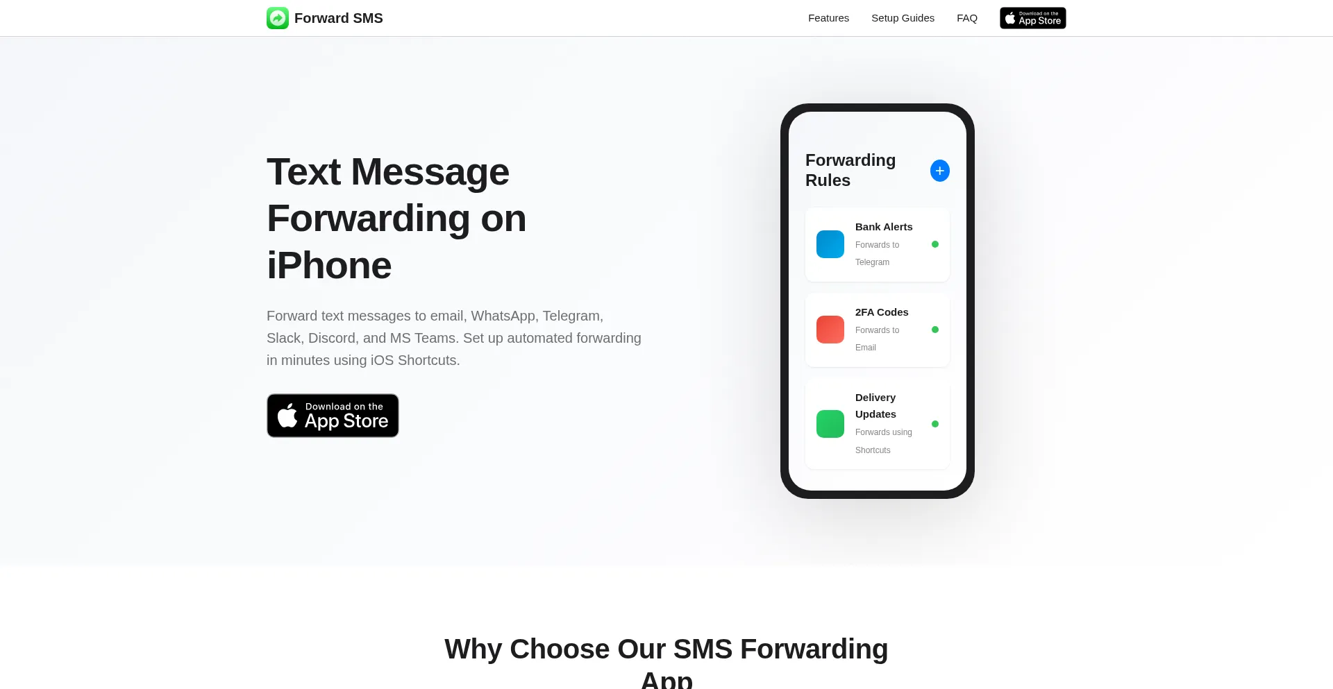 smsforwardingapp.com 拥有可用的 iOS 移动应用程序,表明为 Apple 设备用户提供跨平台可访问性。