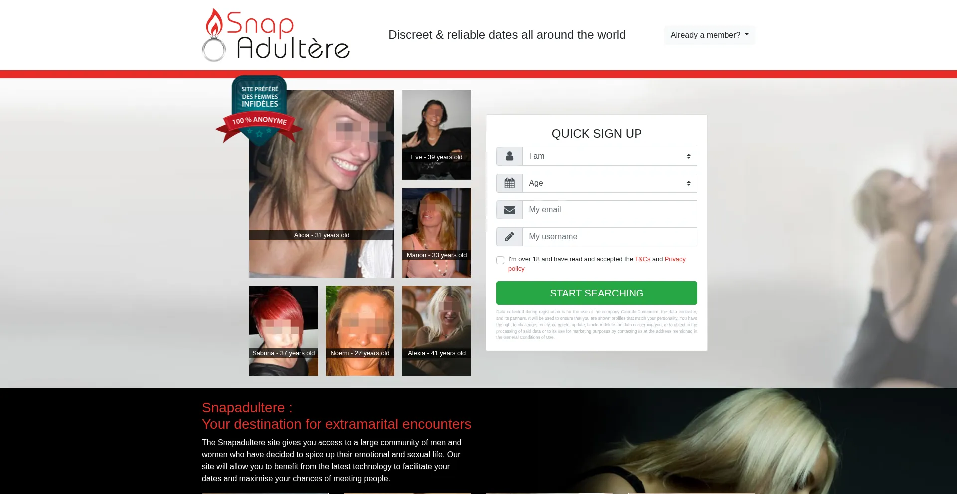 该网站实现数据收集表单,请求个人信息,包括姓名、电子邮件地址、电话号码或其他敏感详细信息。用户应验证 snapadultere.com 的合法性并在提交个人数据前查看隐私政策。